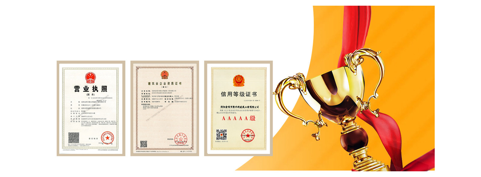 我公司先后受到遼寧省建筑業(yè)協會的好評,遼寧省及沈陽市工商局頒發(fā)的重合同守信譽企業(yè)稱號,勞動保障監(jiān)察書面誠信等級A,信用遼寧網站公示AAA等級,信用沈陽網站公示AAA等級,水利安全生產標準化二級單位,中國水利工程協會信用AAA等級,